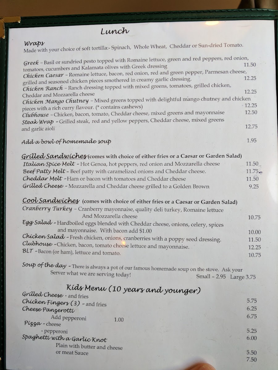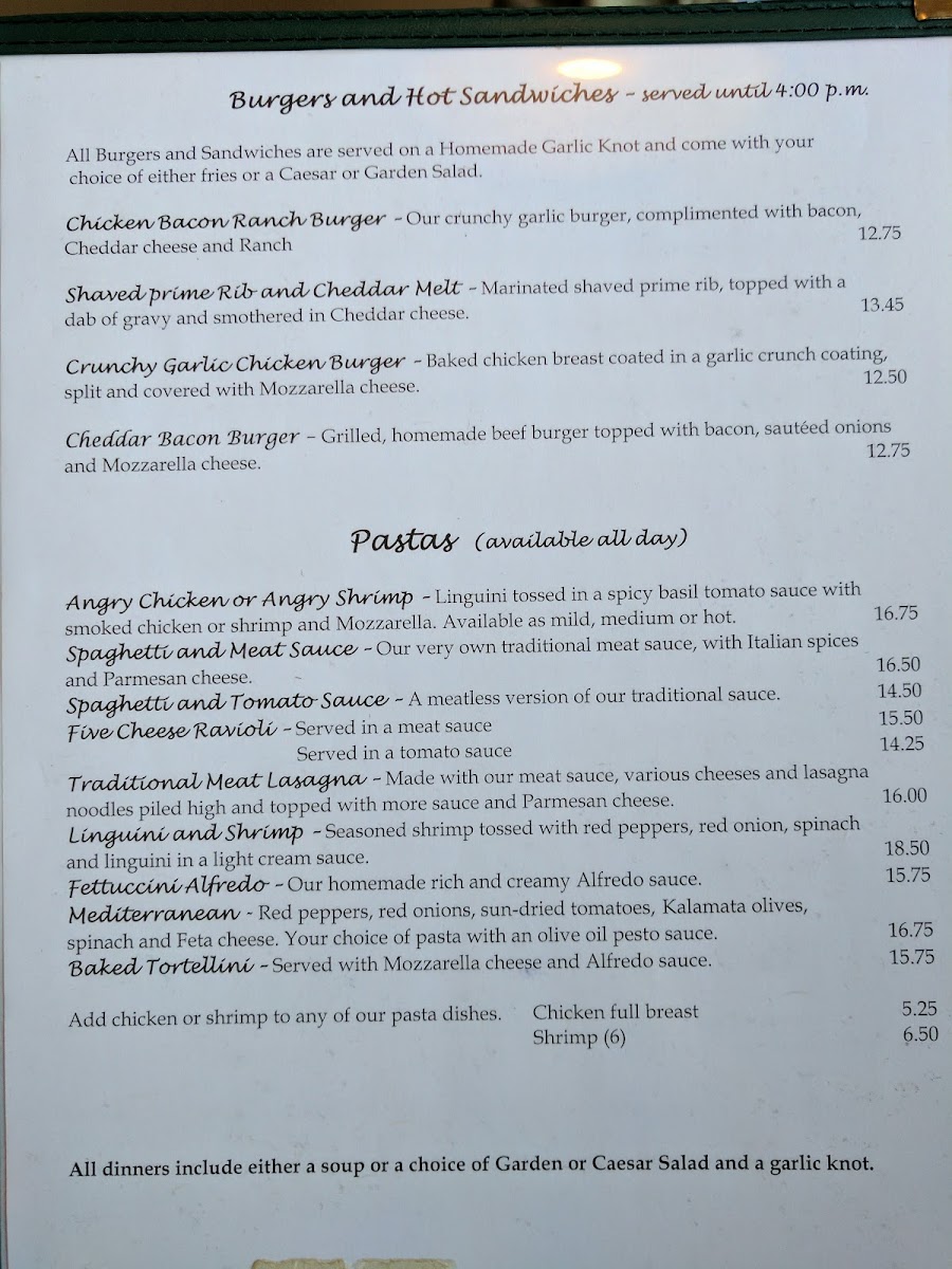 The menu features a variety of options ranging from comforting pastas like traditional meat lasagna and fettuccini Alfredo to hearty burgers and hot sandwiches, such as the chicken bacon ranch burger or a shaved prime rib melt. For younger guests or lighter appetites, the kids menu presents familiar favorites like grilled cheese and spaghetti with a garlic knot.